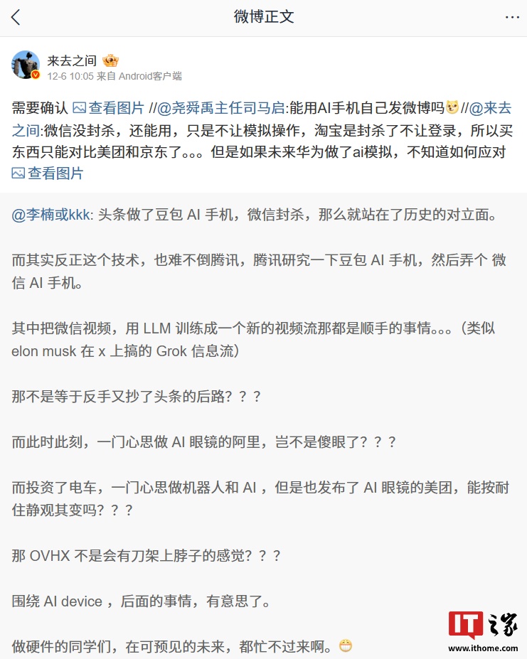 ▲ 图源:微博 CEO 王高飞此外,王高飞还解答了网友对于能否使用 AI 手机我方发微博这一问题:“需要证明。”但从王高飞我方共享的图片来看,AI 手机也曾不错终了我方发微博这一操作,预测是在发微博的某一个要领需要手动证明。